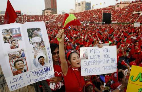 周六晚,多達五萬名他信支持者齊集在曼谷一個球場內(nèi),參加集會。身在海外的他信發(fā)表預(yù)先錄制的錄像講話,向支持者說,如果軍方領(lǐng)袖繼續(xù)干涉政事,泰國的混亂局面將會永無止境,延續(xù)下去。臺下的群眾大多穿上紅衣,以示團結(jié),他們聽到他信的講話都歡呼喝采。
