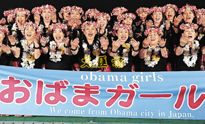 中新網(wǎng)10月30日電 日本一個(gè)有3.2萬人居住的古老漁鎮(zhèn)小濱巿(Obama),因日語發(fā)音與奧巴馬名字發(fā)音一樣,自從他有機(jī)會(huì)問鼎總統(tǒng)寶座后,便獲得該巿大力支持,希望他勝選。據(jù)香港《文匯報(bào)》30日?qǐng)?bào)道,約50名小濱居民苦練夏威夷草裙舞技,打算在大選當(dāng)日到奧巴馬家鄉(xiāng)夏威夷表演。圖為今年5月小濱市的家庭主婦們組成的“奧巴馬女郎”拉拉隊(duì),大跳草裙舞為奧巴馬助威。