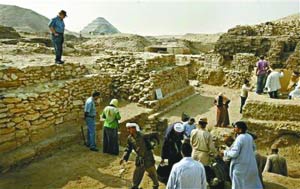 埃及考古人員在塞加拉古葬場(chǎng)挖掘金字塔基座。