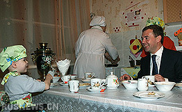 梅德韋杰夫考察孤兒院與孩子一起品嘗煎餅(圖)