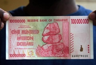 12月4日剛剛發(fā)行的面值1億的津巴布韋元。