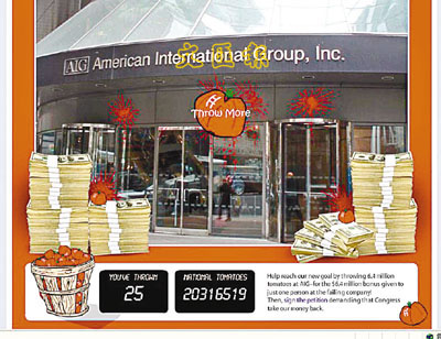 中新網3月25日電 據(jù)香港《明報》25日援引外電報道,美國AIG花紅風暴,令民眾氣憤難平,自由派網站日前在網上開設“擲西紅柿”泄憤游戲。網民們可邊詛咒、邊瞄準AIG大樓入口圖片狂擲虛擬西紅柿。