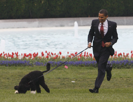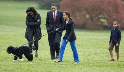 奧巴馬一家早前選定六個(gè)月大的葡萄牙犬“波”為白宮第一狗,他們首次在白宮南草坪放狗,“波”表現(xiàn)活躍,一對(duì)女兒很喜歡這只狗。