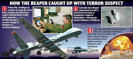 據(jù)英國(guó)媒體11月25日?qǐng)?bào)道,美國(guó)軍隊(duì)22日曾對(duì)巴基斯坦西北部落地區(qū)發(fā)動(dòng)導(dǎo)彈襲擊,并使得包括英籍恐怖頭目拉希德-拉烏夫在內(nèi)的至少5名恐怖分子死亡。美軍最新披露的消息顯示,駐阿美軍當(dāng)天是在得到準(zhǔn)確的地面情報(bào)后,遠(yuǎn)程遙控一架正在附近巡邏的無(wú)人機(jī)前往發(fā)動(dòng)襲擊的。