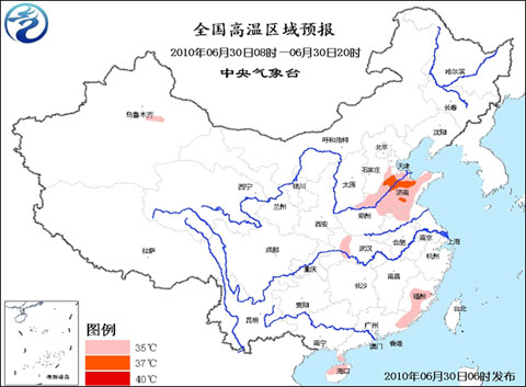 中新網(wǎng)6月30日電 中央氣象臺(tái)6月30日06時(shí)繼續(xù)發(fā)布高溫藍(lán)色預(yù)警:預(yù)計(jì),今天白天,河北南部、河南東部和北部、山東大部、安徽北部、江蘇西北部、湖北西部、福建中南部的部分地區(qū)、廣東東部、海南北部等地有35~37℃的高溫。