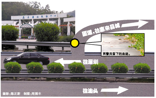 昨日記者來到事發(fā)現(xiàn)場(chǎng),幾位揭陽市公安局交警支隊(duì)惠來高速公路大隊(duì)的民警正在現(xiàn)場(chǎng)做警戒。警戒線圍起的事發(fā)地點(diǎn),就位于深汕高速進(jìn)入服務(wù)區(qū)路口不遠(yuǎn)處。這個(gè)路口可以通往惠來縣城,也可通往惠來高速公路大隊(duì)。