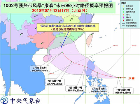 中央氣象臺(tái)消息,今年第2號(hào)熱帶風(fēng)暴“康森”(CONSON)已于7月12日下午加強(qiáng)為強(qiáng)熱帶風(fēng)暴,下午5時(shí)其中心位于菲律賓馬尼拉以東大約830公里的西北太平洋洋面上,就是北緯14.3 度,東經(jīng)128.7度,中心附近最大風(fēng)力有10級(jí)(25米/秒),中心附近最低氣壓985百帕。