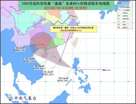 中新網(wǎng)7月14日電 中央氣象臺(tái)今天10時(shí)發(fā)布的臺(tái)風(fēng)黃色預(yù)警稱:今年第2號(hào)強(qiáng)熱帶風(fēng)暴“康森”的中心已于今天上午8時(shí)由菲律賓呂宋島西南部移入中國(guó)南海東部海面,9時(shí)其中心距海南省文昌市東南方大約1090公里(北緯14.8度、東經(jīng)119.8度),中心附近最大風(fēng)力有10級(jí)(28米/秒),中心最低氣壓985hPa。