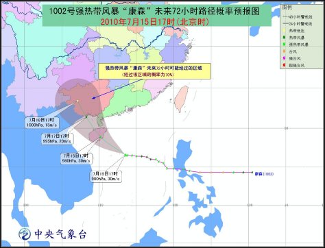 預(yù)計,“康森”將以每小時15-20公里的速度向西偏北方向移動,強度還將有所增強,有可能發(fā)展為臺風(fēng),將于16日中午到夜間在海南文昌到三亞一帶沿海登陸。