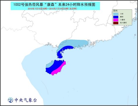 受其影響,15日晚上到16日白天,南海北部和中部、海南省及其沿海、瓊州海峽、廣東西部沿海、北部灣東部海面將有7-9級大風(fēng),“康森”中心經(jīng)過的附近海面或地區(qū)的風(fēng)力可達10-12級;海南、廣東西南部將有大到暴雨,其中海南東部的部分地區(qū)有大暴雨,局地有特大暴雨。