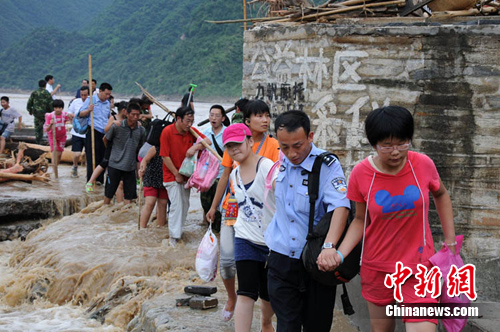 搶救突擊隊(duì)冒著洪水和山體滑坡的危險(xiǎn),沿著沖毀的道路,一邊行進(jìn)一邊開(kāi)路。2公里水毀路段,整整走了3個(gè)多小時(shí)。到達(dá)旅游團(tuán)被困地點(diǎn)后,搶救突擊隊(duì)員顧不上休息,背起較小的孩子,攙扶起較大的孩子,帶領(lǐng)旅游團(tuán)隊(duì)踏上歸途。