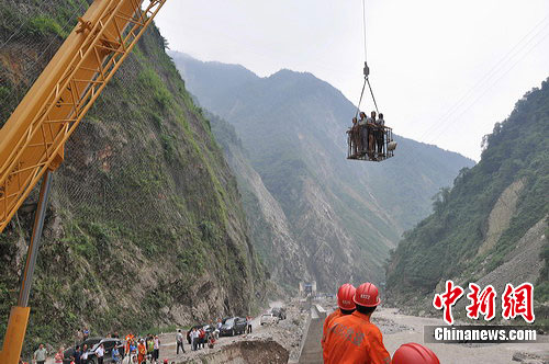 事發(fā)后,綿竹市政府立即調(diào)派大型機(jī)械疏導(dǎo)交通。10時(shí)許,隨著水位下降,綿竹市防洪辦率礦山救援隊(duì)和大型吊車(chē)、裝載機(jī)進(jìn)入天池鄉(xiāng)。德陽(yáng)市消防支隊(duì)副支隊(duì)長(zhǎng)李先平也率增援力量到達(dá)現(xiàn)場(chǎng),F(xiàn)場(chǎng)成立救援指揮部,并根據(jù)現(xiàn)場(chǎng)情況部署改進(jìn)救援方案。由于水位下降后,河床寬度明顯減小,指揮部決定利用吊車(chē)長(zhǎng)臂懸掛鋼筋鐵框伸過(guò)河床救人,一次可以裝上6、7個(gè)人,大大減少了救援時(shí)間。15時(shí)許,經(jīng)過(guò)全體救援人員的不懈努力,50余名被困人員被成功解救,無(wú)一人受傷。