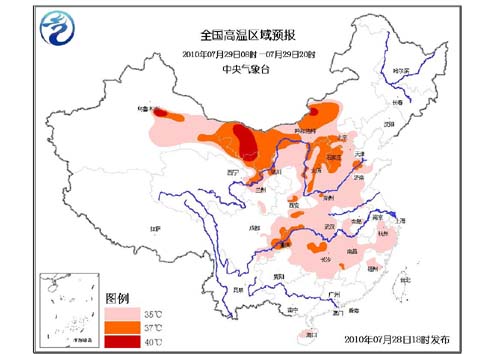 中央氣象臺發(fā)布的高溫黃色預(yù)警稱:明天(29日)白天,北京、天津、河北大部、山西、陜西關(guān)中地區(qū)和東部、寧夏中北部、河南大部、山東中西部、安徽北部、湖北、四川盆地東部、重慶、貴州東北部、湖南大部、江西中北部、浙江大部、福建北部、海南北部等地有35℃以上的高溫天氣,局地最高氣溫可達37~38℃;內(nèi)蒙古中西部、甘肅大部、新疆吐魯番盆地及南疆盆地東部等地將有35~37℃的高溫天氣,局地最高氣溫可達40℃以上。