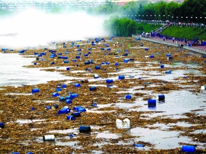 記者下午在吉林市城區(qū)內(nèi)的一處松花江段看到,江面上漂浮著幾十個藍色的原料桶,江邊異常的氣味不太明顯。