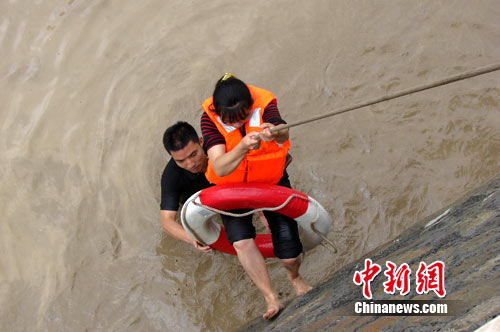 消防官兵搜尋到中攤堡大道,聽到中普建設(shè)楓香樹村安置房與中攤堡安置房交界處傳來求救聲音,利用強(qiáng)光手電筒發(fā)現(xiàn):洪水已將4名來不及疏散的施工人員團(tuán)團(tuán)包圍,工人在樓頂揮手、呼喊求救。“不要著急,我們馬上想辦法過來救你們”。由于水流很急且到處都是施工隊(duì)挖的暗溝,時(shí)間緊迫,消防站余柯政站長來不及多考慮,立即下令,將保險(xiǎn)繩拴在消防車上,余站長和劉飛穿上救生衣,綁好安全繩后,帶著救生圈慢慢的游到被困群眾位置,將救生衣為民工穿好后,一邊由消防官兵護(hù)送一邊由在消防車一邊的其余消防官兵牽引安全繩接應(yīng),緊急轉(zhuǎn)移被困群眾。一趟、兩趟、三趟……經(jīng)過近半小時(shí)的奮戰(zhàn),成功救出被困工人。