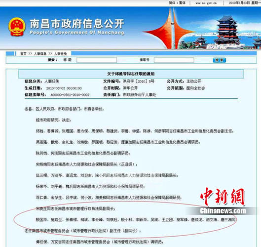 8月23日,中新網(wǎng)記者在南昌市政府信息公開(kāi)網(wǎng)找到南昌市政府發(fā)布的洪府字[2010]5號(hào)文件,該文件名為“關(guān)于邱勝等同志任職的通知”(以下簡(jiǎn)稱為“通知”)。通知顯示,南昌市政府任命了一批南昌市工業(yè)和信息化委員會(huì)、市人力資源和社會(huì)保障局、市城市管理委員會(huì)(城市管理行政執(zhí)法局)以及市文化新聞出版局的官員。