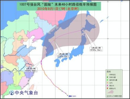 今年第7號臺風(fēng)“圓規(guī)”于9月1日13時(shí)在東海北部海面上加強(qiáng)為強(qiáng)臺風(fēng),17時(shí)其中心位于韓國濟(jì)州西偏南方大約170公里的海面上,就是北緯33.2度、東經(jīng)124.7度,中心附近最大風(fēng)力有14級(45米/秒),中心最低氣壓為955百帕。