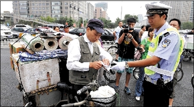 昨天上午9點(diǎn),記者在東單路口看到,8名民警“把守”在路口4個(gè)方向,由于正值上班高峰,路口騎車(chē)人較多,大部分人能等待紅燈,幾名想“闖關(guān)”的騎車(chē)人被民警和協(xié)管員攔住。市民小陳騎電動(dòng)自行車(chē)載人,被執(zhí)勤民警攔下并處以罰款20元。記者注意到,民警處理的多是自己加裝動(dòng)力裝置的三輪車(chē)!白孕屑友b動(dòng)力裝置很危險(xiǎn)!泵窬f(shuō),行人、非機(jī)動(dòng)車(chē)的違法行為主要有騎車(chē)帶人、逆行、闖紅燈等。昨天上午兩個(gè)小時(shí)內(nèi),僅東單路口一處,民警就處罰了20多起行人、非機(jī)動(dòng)車(chē)的違法行為。