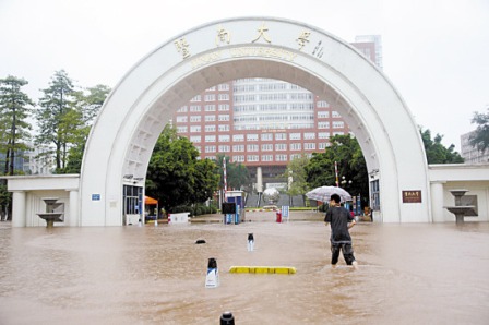 7時20分,在暨南大學(xué)正門,看到水已經(jīng)浸到了黃埔大道路邊直至,水勢最深處約有40厘米,學(xué)生撐著傘在水中緩緩前行。暨大的門衛(wèi)表示,今次雖然水浸,但是地下車庫并沒有受淹。