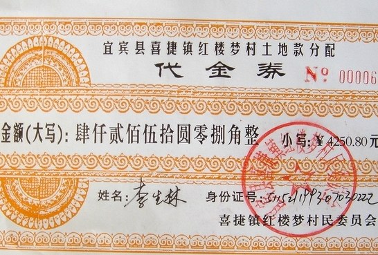四川宜賓喜捷鎮(zhèn)紅樓夢(mèng)村的村民近日向中國(guó)之聲反映,當(dāng)?shù)卮逦瘯?huì)把多年來(lái)拖欠農(nóng)民的400萬(wàn)元土地款印成了精美的代金券,替代人民幣發(fā)給了農(nóng)民。這些代金券可以在本村內(nèi)轉(zhuǎn)讓、贈(zèng)予,還可以繼承。但如果想換成真錢卻要等到60多歲。記者調(diào)查發(fā)現(xiàn),400萬(wàn)代金券的背后,還隱藏著更大的玄機(jī)。