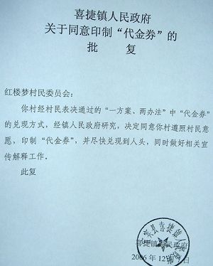 那么,村委會(huì)私自印制發(fā)行代金券的行為是否合法呢?面對(duì)記者的追問,三位村官都以沉默作答。再三追問之下,他們出示了當(dāng)?shù)劓?zhèn)政府對(duì)此做過的批示。批示上蓋有宜賓縣喜捷鎮(zhèn)人民政府的公章。批復(fù)中寫道,經(jīng)鎮(zhèn)人民政府研究,決定同意你村印制代金券。