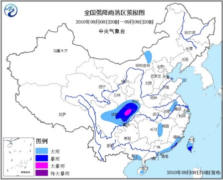 中新網(wǎng)9月8 日電 據(jù)中央氣象臺(tái)網(wǎng)站消息,中央氣象臺(tái)9月8日18時(shí)發(fā)布暴雨藍(lán)色預(yù)警:9月8日20時(shí)到9日20時(shí),四川盆地、川西高原中部、甘肅東南部、陜西南部、重慶西部和北部、福建東南部沿海、廣東中東部沿海、臺(tái)灣中南部等地有大雨或暴雨,其中,四川盆地東北部局地有大暴雨。另外,內(nèi)蒙古中部、山東半島東部、蘇皖中部、江西西部、廣西東南部、海南南部等地的部分地區(qū)有大雨。上述局部地區(qū)并伴有短時(shí)雷雨大風(fēng)或冰雹等強(qiáng)對(duì)流天氣。