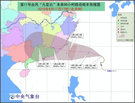 預(yù)計(jì),“凡亞比”中心將以每小時(shí)10-15公里的速度先向西偏北方向移動(dòng),以后逐漸轉(zhuǎn)向偏西方向移動(dòng),移速將略有加快,強(qiáng)度繼續(xù)加強(qiáng),并向我國(guó)臺(tái)灣東部一帶沿海靠近,將于19日凌晨到白天在臺(tái)灣東部沿海登陸;之后,“凡亞比”將穿越臺(tái)灣島進(jìn)入臺(tái)灣海峽,向福建中部到廣東東部一帶沿?拷