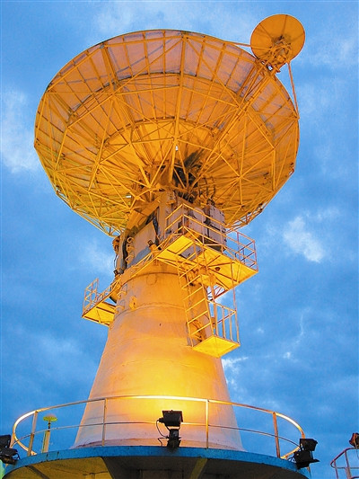 甲板上,2個(gè)巨大的乳白色雷達(dá)鍋,警覺地注視著衛(wèi)星即將飛來的方位。船艙內(nèi),一排排彩色顯示屏幕上,不斷變化著各種信息畫面和數(shù)據(jù)。船員們各自堅(jiān)守著崗位。