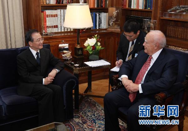 中國國務(wù)院總理溫家寶3日在雅典會見希臘總統(tǒng)帕普利亞斯。