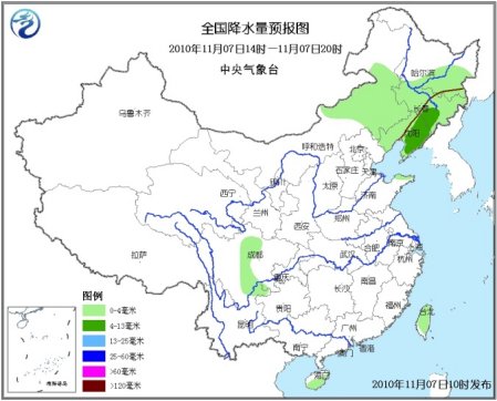 今天14時至20時,內蒙古中東部有小到中雪;黑龍江南部、吉林西部、遼寧西部等地有雨夾雪;遼寧東部、吉林東部、山東半島北部、川西高原東部、云南東北部、海南南部、臺灣大部有小到中雨或陣雨。