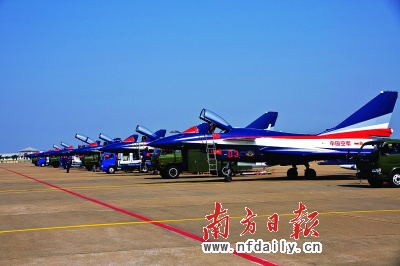 昨日中午12點(diǎn)15分,中國空軍八一飛行表演隊(duì)已經(jīng)飛抵珠海。伴隨著飛機(jī)引擎的轟鳴,3架以藍(lán)、白、紅為主色的殲10出現(xiàn)在珠海航展中心上空。3架飛機(jī)宛如三把直刺長(zhǎng)空的利劍,連續(xù)兩次掠過藍(lán)天,然后相繼在珠海機(jī)場(chǎng)降落。約12點(diǎn)45分,另外4架殲10也相繼到達(dá)(見圖,陳俊攝)。這意味著換裝殲10飛機(jī)后的航展期間,八一飛行表演隊(duì)每天都將進(jìn)行一場(chǎng)飛行表演,準(zhǔn)備了18套動(dòng)作,每次表演時(shí)間約22分鐘。