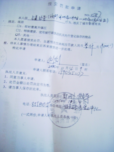 記者現(xiàn)場調(diào)查采訪時,發(fā)現(xiàn)大多攤主的手中,除了攤位費收款收據(jù)外,還有一張由“鎮(zhèn)江市城市管理行政執(zhí)法局潤州分局”印制的“預交罰款申請”單復印件,申請人是組織者劉某。內(nèi)容是“本人因占道經(jīng)營行為,違反了城市管理有關(guān)規(guī)定,本人愿意接受處罰,自愿預先繳納相應罰款人民幣叁仟元整,待本人事情辦理結(jié)束后再來接受進一步處理”。