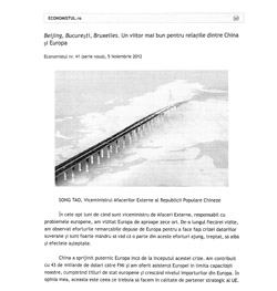 中新網(wǎng)11月9日電 據(jù)外交部網(wǎng)站消息,2012年11月5日,羅馬尼亞主流媒體《經(jīng)濟學(xué)家報》和《九點鐘報》分別用羅、英兩種文字全文刊登中國外交部副部長宋濤署名文章《為了中歐關(guān)系的美好未來》。