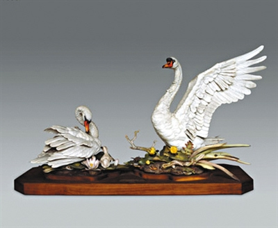 在中國(guó)國(guó)家博物館國(guó)際友誼館中,有一組“天鵝之家”燒瓷工藝品——一只雄天鵝引頸展翅,一只雌天鵝曲頸梳理,三只小天鵝偎依在父母身邊,它們見證了中美友誼的開端。