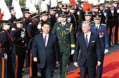 昨日,習(xí)近平在會(huì)見(jiàn)比利時(shí)國(guó)王菲利普前,出席菲利普國(guó)王在王宮廣場(chǎng)舉行的隆重歡迎儀式。新華社發(fā)