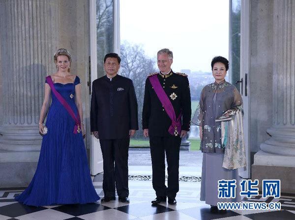 3月31日晚,比利時國王菲利普在布魯塞爾拉肯宮舉行隆重國宴歡迎國家主席習(xí)近平到訪。習(xí)近平和夫人彭麗媛抵達時,受到菲利普國王和瑪?shù)贍柕峦鹾鬅崆橛印?新華社記者 龐興雷 攝