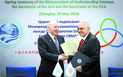 5月20日,亞洲相互協(xié)作與信任措施會(huì)議秘書處與上海合作組織秘書處在亞信第四次峰會(huì)新聞中心舉行簽署諒解備忘錄儀式。 竺鋼 攝