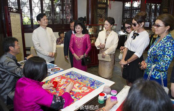 彭麗媛和貴賓們到上海豫園,參觀金山農(nóng)民畫、面塑、顧繡、木版水印、扎染等展示,欣賞少兒歌舞《茉莉花》、昆曲《牡丹亭》選段、滬劇與二胡《燕燕做媒》、太極·古琴《高山流水》、京劇選段《梨花頌》等演出。