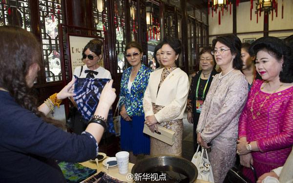 彭麗媛和貴賓們在豫園靜觀的展臺前駐足停留,聽取介紹。彭麗媛不時拿起面塑、扎染布等傳統(tǒng)手工藝品給貴賓們欣賞。“農(nóng)民畫用的是什么顏料?”“木版水印和版畫有什么區(qū)別?”“扎染布會褪色嗎?”……大家紛紛提問,同非物質(zhì)文化遺產(chǎn)傳承人親切交流。
