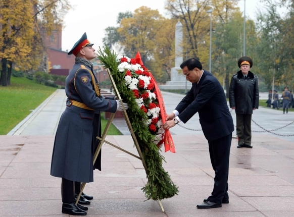 俄方為李克強(qiáng)總理安排的第一場(chǎng)正式活動(dòng)就是向克里姆林宮外的無(wú)名烈士墓獻(xiàn)花圈,意涵豐富深刻。