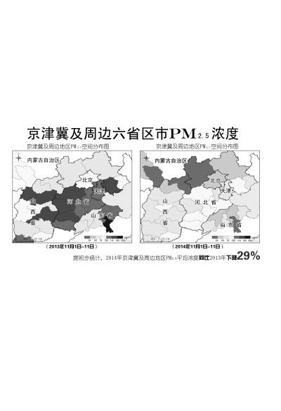 APEC期間區(qū)域大氣環(huán)境遙感監(jiān)測(cè)結(jié)果顯示,京津冀及周邊地區(qū)大氣PM2.5濃度同步出現(xiàn)了不同程度的下降,各地空氣質(zhì)量都得到了明顯改善。
