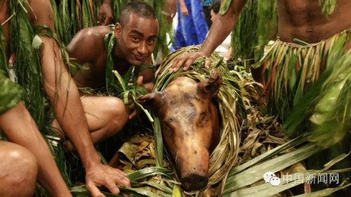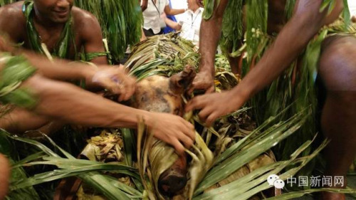 喝完卡瓦汁,斐濟原住民又把烤豬、芋頭什么的抬上來啦,一人還上前致祝福語。習(xí)大大點頭致意。斐濟禮賓官代表習(xí)大大接受獻品并致謝。然后,原住民將食物抬下。