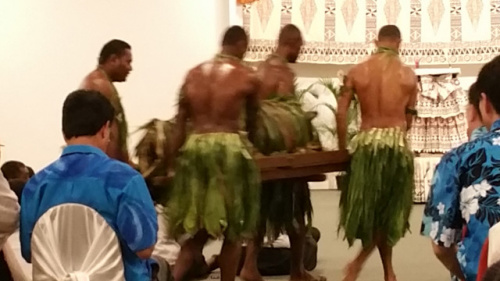 一名斐濟原住民將草席獻至習(xí)大大面前,另一人手持鯨魚牙向習(xí)大大致祝福語并獻上鯨魚牙。咦,不是剛剛獻過一次嗎?不管那么多了,接過鯨魚牙再次轉(zhuǎn)交給斐濟禮賓官,禮賓官向獻禮人拍掌并表示感謝。之后,斐濟原住民將草席撤下。