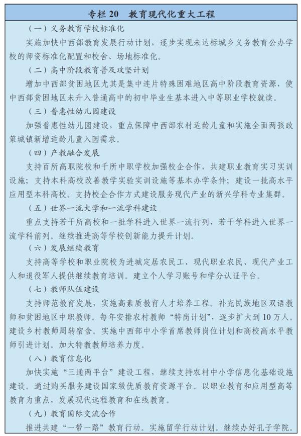 深化教育改革,增強(qiáng)學(xué)生社會責(zé)任感、法治意識、創(chuàng)新精神、實(shí)踐能力,全面加強(qiáng)體育衛(wèi)生、心理健康、藝術(shù)審美教育,培養(yǎng)創(chuàng)新興趣和科學(xué)素養(yǎng)。深化考試招生制度和教育教學(xué)改革。推行初高中學(xué)業(yè)水平考試和綜合素質(zhì)評價。全面推開中小學(xué)教師職稱制度改革,改善教師待遇。推動現(xiàn)代信息技術(shù)與教育教學(xué)深度融合。依法保障教育投入。實(shí)行管辦評分離,擴(kuò)大學(xué)校辦學(xué)自主權(quán),完善教育督導(dǎo),加強(qiáng)社會監(jiān)督。建立分類管理、差異化扶持的政策體系,鼓勵社會力量和民間資本提供多樣化教育服務(wù)。完善資助體系,實(shí)現(xiàn)家庭經(jīng)濟(jì)困難學(xué)生資助全覆蓋。
