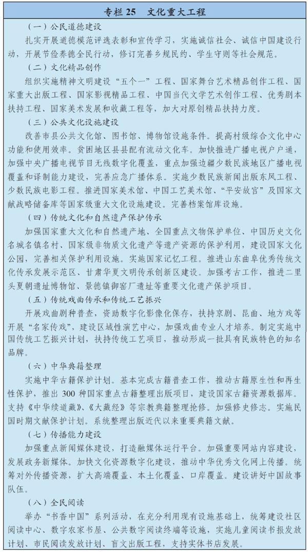 構(gòu)建中華優(yōu)秀傳統(tǒng)文化傳承體系,實(shí)現(xiàn)傳統(tǒng)文化創(chuàng)造性轉(zhuǎn)化和創(chuàng)新性發(fā)展。廣泛開(kāi)展優(yōu)秀傳統(tǒng)文化普及活動(dòng)并納入國(guó)民教育,繼承五四運(yùn)動(dòng)以來(lái)的革命文化傳統(tǒng)。大力推行和規(guī)范使用國(guó)家語(yǔ)言文字。加強(qiáng)文物保護(hù)利用,杜絕破壞性開(kāi)發(fā)和不當(dāng)經(jīng)營(yíng)。加強(qiáng)非物質(zhì)文化遺產(chǎn)保護(hù)與傳承,振興傳統(tǒng)工藝,傳承發(fā)展傳統(tǒng)戲曲。發(fā)展民族民間文化,扶持民間文化社團(tuán)組織發(fā)展。
