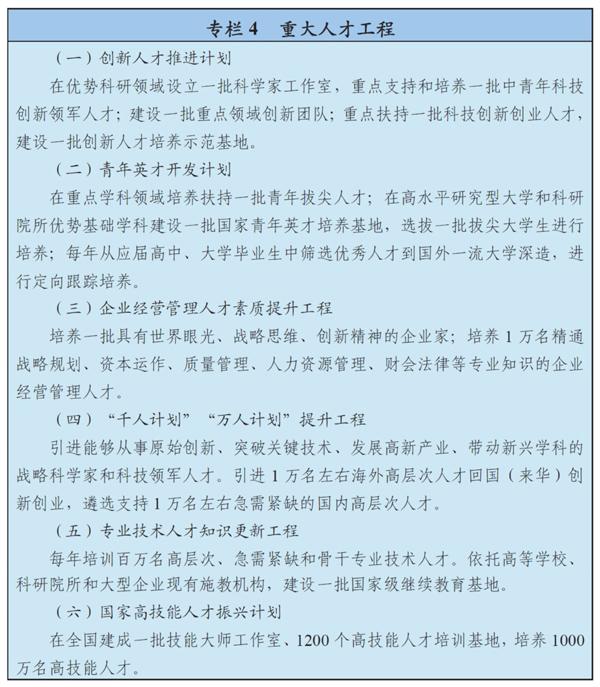 推動人才結構戰(zhàn)略性調整,突出“高精尖缺”導向,實施重大人才工程,著力發(fā)現、培養(yǎng)、集聚戰(zhàn)略科學家、科技領軍人才、社科人才、企業(yè)家人才和高技能人才隊伍。培養(yǎng)一批講政治、懂專業(yè)、善管理、有國際視野的黨政人才。善于發(fā)現、重點支持、放手使用青年優(yōu)秀人才。改革院校創(chuàng)新型人才培養(yǎng)模式,引導推動人才培養(yǎng)鏈與產業(yè)鏈、創(chuàng)新鏈有機銜接。