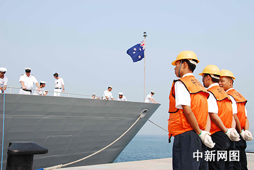 中國海軍在碼頭上舉行了熱情的歡迎儀式。軍樂隊高奏迎賓曲。數(shù)百名水兵列隊迎接,與新西蘭軍艦站坡官兵隔水相望,互至注目禮。兩名中國海軍女戰(zhàn)士向走下舷梯的大衛(wèi)•安森準(zhǔn)將和格蘭特艦長敬獻(xiàn)了鮮花。南海艦隊副參謀長么志樓將軍與大衛(wèi)•安森準(zhǔn)將握手,對新西蘭軍艦到訪南海艦隊表示歡迎。