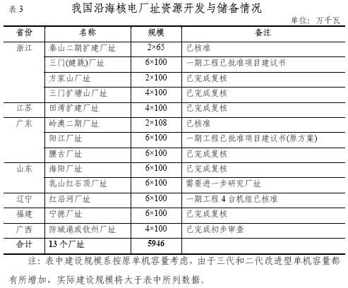 從廠址條件看,到2020年,表3所列核電廠址容量可以滿足運行4000萬千瓦、在建1800萬千瓦的目標。結合我國能源資源和生產力布局情況,從現(xiàn)在起到2020年,新增投產2300萬千瓦的核電站,將主要從上述沿海省份的廠址中優(yōu)先選擇,并考慮在尚無核電的山東、福建、廣西等沿海省(區(qū))各安排一座核電站開工建設。