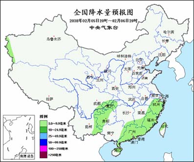5日20時至6日20時,新疆西南部、浙江北部、江西東北部、云南東北部等地陰有小到中雪或雨夾雪;湖南南部、江西南部、浙江中南部、福建大部、廣東、廣西東部、海南以及四川盆地南部、重慶大部、貴州中西部、云南東南部、臺灣等地陰有小雨,其中,貴州中西部的部分地區(qū)有凍雨。內(nèi)蒙古中東部、華北北部、東北地區(qū)、黃淮東部等地有4級左右偏北風;東部和南部海區(qū)有5~7級偏北風。