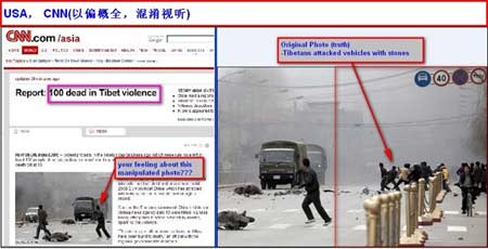 聲明中寫道:“一個(gè)叫‘’的網(wǎng)站和其他一些地方對(duì)于CNN在西藏事件上的報(bào)道點(diǎn)名批評(píng)!睂(duì)于中國(guó)網(wǎng)民對(duì)CNN將一張圖片中“藏獨(dú)”分子向卡車投擲石塊的畫面進(jìn)行剪裁的不滿,CNN辯稱,“受到質(zhì)疑的那幅照片被完全‘適當(dāng)?shù)亍瘧?yīng)用在了特定的編輯內(nèi)容中”,并稱所展示的內(nèi)容不會(huì)引起誤解。